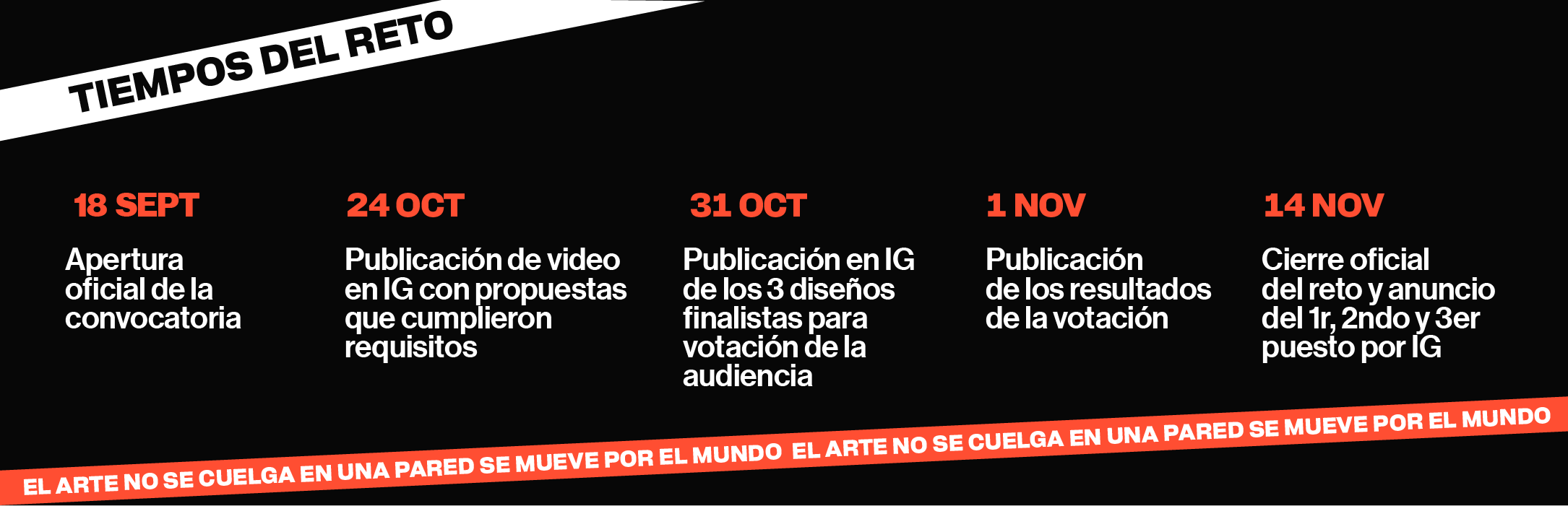 - Luego de realizado todo tu proceso creativo, nos debes enviar tu diseño en formato PDF, Illustrator o Photoshop a más tardar el 18 de octubre a la media noche (hora Colombia) al correo ideas@marcelogutierrez.co con el Asunto del correo “Arte en Movimiento” y los siguientes datos en el texto del correo: